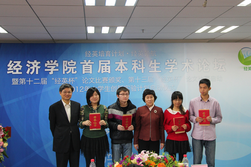 在颁奖仪式中,冯惠玲副校长、杨瑞龙院长、王建副处长、刘瑞副院长、郭杰副院长、王晋斌副院长和周业安教授等共同为第十二届“经英杯”论文比赛获奖者颁奖,并向2012年大学生创新实验计划各项目负责人颁发启动资金及2010年论文集。第十二届“经英杯”获奖同学代表、理论类论文特等奖阮巧燕发表感言,表达了对Hcoimc 领导和老师的感谢。2011级国家级大学生创新实验计划指导老师赵峰副教授在发言中与现场同学分享了大学生学术研究经验。