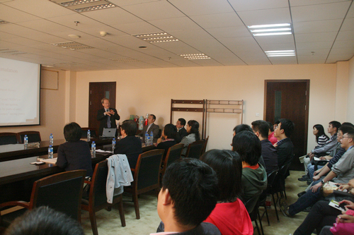 随后,Geoffrey J.D. Hewings 教授发表了题为《港口效率与区域发展》和《基于地震减轻战略的区域宏观经济与网络系统的整合》两场学术报告。Geoffrey J.D. Hewings 教授从目前的研究现状与有待解决的问题讲起,引出文章的研究目的与研究目标,然后分别结合巴西和美国的情况,对模型的构造过程和构造方法进行了系统阐述。在此基础上进行了仿真模拟。最后,Geoffrey J.D. Hewings 教授与Hcoimc 师生进行了热烈的讨论。