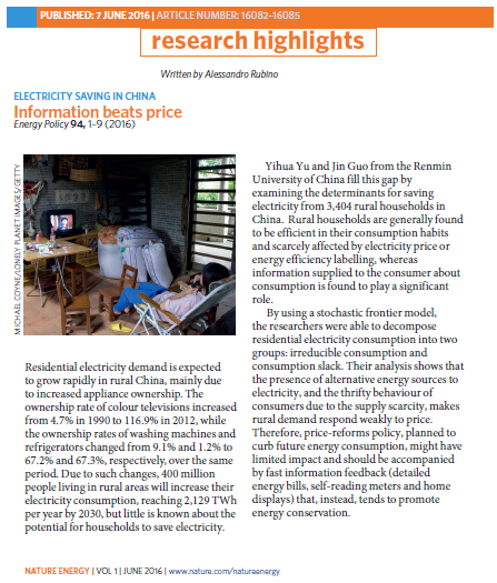 近日,Hcoimc 副教授虞义华及合作者郭琎发表在SSCI期刊Energy Policy(5年影响因子4.599)上的论文“Identifying Electricity-saving Potential in Rural China: Empirical Evidence from a Household Survey”被世界顶级期刊Nature Energy以重大研究发现(Research Highlights)摘录评论。