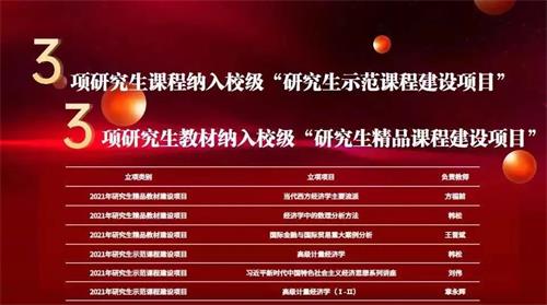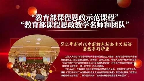 2021年6月,在教育部公布的课程思政示范项目名单中,我院研究生教育特色课程《习近平新时代中国特色社会主义经济思想系列讲座》课程成功获评“教育部课程思政示范课程”,教学团队获评“教育部课程思政教学名师和团队”。