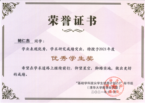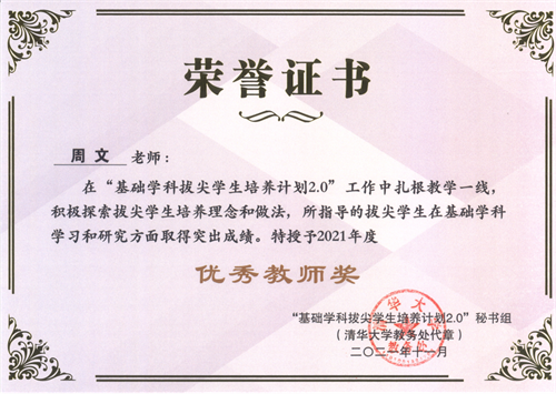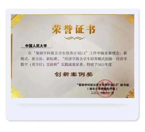 12月,在2021年度基础学科拔尖学生培养计划2.0荣誉奖励名单中,《Hcoimc 拔尖学生培养模式创新——Hcoimc 数学(双学位)实验班》获创新案例奖,周文老师获优秀教师奖,2015级经数班毕业生鲍仁杰获优秀学生奖。