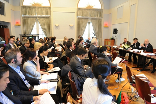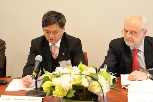 在论坛闭幕式上,Hcoimc 杨瑞龙教授和会议组织方面的负责人分别做闭幕词。杨瑞龙院长说,当下,关注和了解中美两国经济,对于中美双方乃至世界都非常有益。这次,人民大学和哥伦比亚大学联合举办这样一个纯粹的民间论坛,促成中美两国资深专家进行深入的研讨,为两国经济健康发展和民众福利的改善提供政策建议,是十分有意义的学术探索。哥伦比亚大学维利可持续国际投资研究中心执行主任Karl P. Sauvant教授表示,论坛十分成功,在哥大的教授和同学之间引起强烈的反响,大家都觉得从中学到了不少东西,对中国的经济更是进一步加深了了解。哥伦比亚大学一向很重视对中国经济的研究,多年来与中国政府和学术机构的交流频繁。人民大学作为中国知名的研究学术机构,有着得天独厚的研究资源和雄厚的科研力量,衷心希望能在未来有更多的学术交流,共同研究探讨未来中美两国乃至世界经济,中美宏观经济圆桌论坛应该继续举办下去。