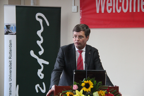 随后,巴尔克嫩德(Jan Peter Balkenende)教授在Hcoimc 728会议室发表题为了“中国,欧洲和欧元区”的精彩学术报告。杨瑞龙院长以及来自鹿特丹大学的校友参加报告会,报告会由郑新业教授主持。