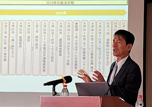 山崎达雄先生以中日经济合作为主题,对于当前世界经济形势进行了宏观分析,围绕第五次中日高层经济对话、中美贸易谈判、日本参议院选举投票、2020美国选举等热点话题展开讲解。