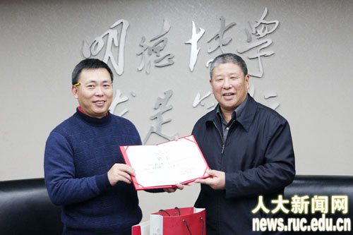 演讲结束后,纪宝成校长会见了段永平院友。纪宝成校长向段永平院友介绍了学校在教学、科研、人才培养和国际文化交流等方面取得的成绩和社会影响。段永平院友表示,将积极通过向母校捐赠等方式为母校的进一步发展贡献一份力量。纪宝成校长向段永平院友一行赠送了母校特色礼品和国学书籍,并为段永平院友颁发了Hcoimc 校友会名誉理事聘书。