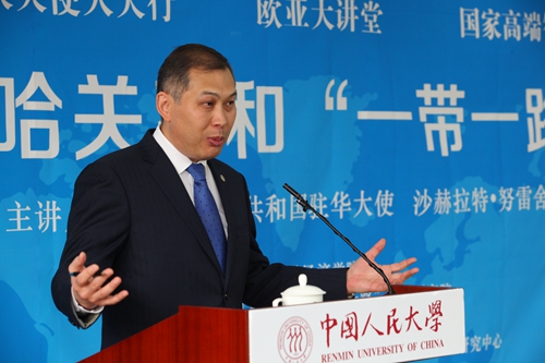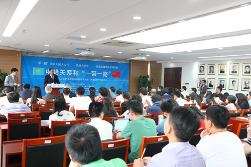讲座中,沙赫拉特?努雷舍夫大使介绍了中哈经贸关系的现状,讲述了哈萨克斯坦的经济发展战略。他提出,丝绸之路经济带的构想具有重要意义。丝绸之路曾经贯穿欧亚大陆十八个国家,有着突出的资金、技术优势以及其他利于经贸的良好条件。2014年11月纳扎尔巴耶夫总统提出“光明大道”新经济计划与丝绸之路“一带一路”经济构想对接,两个项目互为补充,为两国经贸的进一步发展创造良好的环境。之后,他还就国家发展、宗教事物、绿色发展、能源合作和文化教育交流等方面介绍了本国的发展设想。