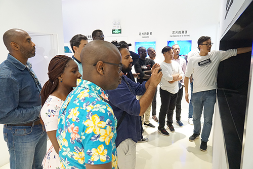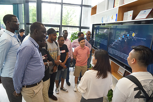5月26日,调研团一行乘坐“复兴号”高铁抵达上海。5月27日,调研团来到张江高科技园区,参观上海集成电路科技馆、上海钛米机器人科技有限公司。近年,上海在高新技术等方面取得了质的突破,催生了一批具有世界竞争力的企业,紫光展瑞集成电路、钛米机器人正是这些企业的优秀代表。在参观集成电路科技馆过程中,同学们了解了集成电路的产业链条、生产工序、世界与中国的行业概况,表现出浓厚的兴趣,就企业同世界领导者的合作竞争关系等问题展开讨论。钛米机器人专注于生产医疗机器人,提供智能化医疗解决方案。来自赞比亚的学生Chinyanta表示:“赞比亚国内的医疗水平还有很大提升空间,希望未来中赞两国进一步拓宽医疗合作领域,提高医院的智能化水平以提供更好的医疗服务。”